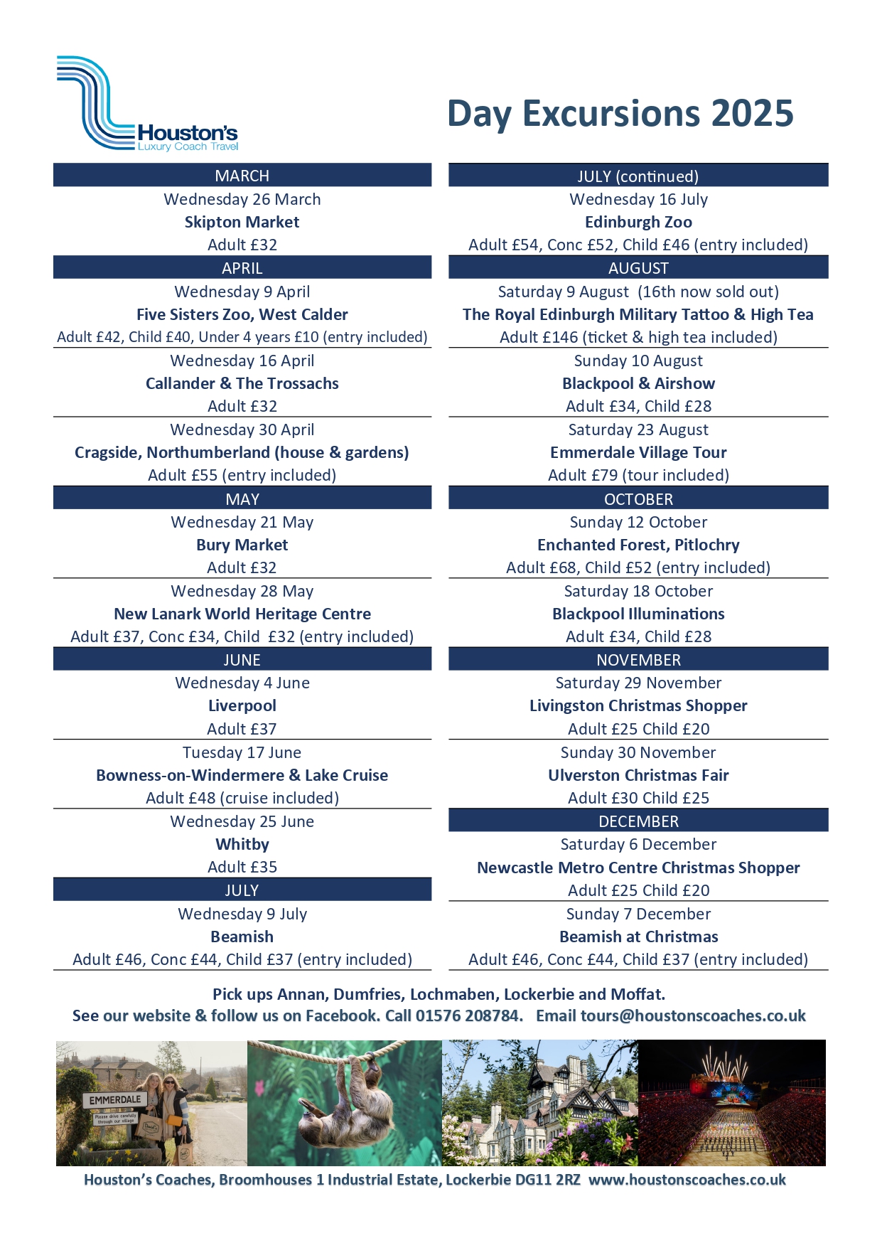 We have a wide variety of day trips organised for the coming months. So whether you want to visit a zoo, spend some time shopping or take a cruise on Lake Windermere, we hope you will find something to interest you in our forthcoming tours. Tours – Houstons Coaches You can call us on 01576 208784 to book your seat.